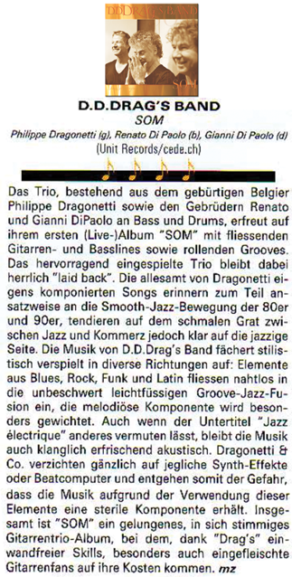 Le trio est remarquablement bien rôdé, mais il reste cependant magnifiquement décontracté. Les morceaux, tous composés pour l'occasion par Dragonetti et qui rappellent le mouvement smooth-jazz des années 80 et 90, ondoient sur la fine crête qui sépare musique jazz de la musique commerciale, mais ils penchent toujours clairement sur le versant jazz. La musique du D.D.Drag's Band s'amuse à s'ouvrir sur un éventail très large de styles: des éléments venant du blues, du rock, du funk et du latino se mélangent sans heurts à la légèreté insouciante de la fusion groove-jazz, la composante mélodique restant toujours particulièrement mise en valeur. Même si le sous-titre "Jazz électrique" laisse entendre autre chose, la musique reste très acoustique en ce qui concerne la sonorité.